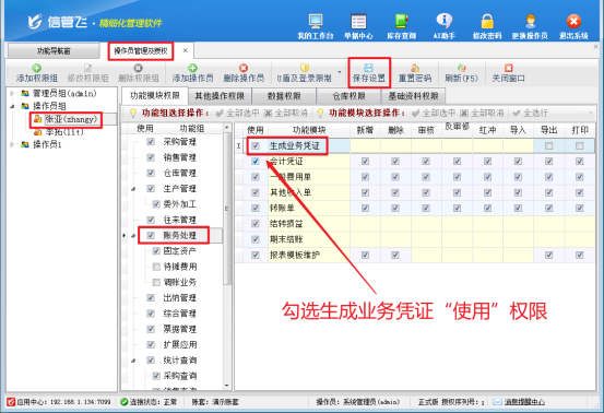 首先系統管理員賬號登錄,點擊“系統管理”—》“操作員及授權”進入操作員管理及授權界面,選擇操作員“張亞”,點擊功能模塊權限,選擇賬務處理,勾選“生成業務憑證”模塊,勾選后點擊保存,如圖: